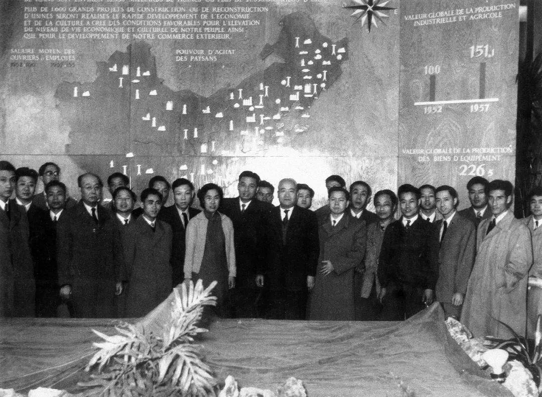 1951年至1959年,张仃先生担任了新中国众多重大展览的首席艺术设计家及总制作:德国莱比锡博览会中国馆、波兰华沙“新中国博览会”、苏联莫斯科“中华人民共和国工农业展览会”……这些展览在德国、奥地利、波兰、捷克等国家展出时,均引起世界瞩目。1956年巴黎国际博览会中国展团合影(右7为张仃)