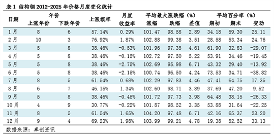 【导语】数据不会说谎,2012-2025年13载复盘,2月以10涨3跌的压倒性胜率,稳坐结构钢年度“最强月份”宝座,其上涨的核心在于春节前后结构钢市场的基本面错配,从今年的情况来看,市场结合基本符合历史规律,2-3月份价格上涨概率较大。